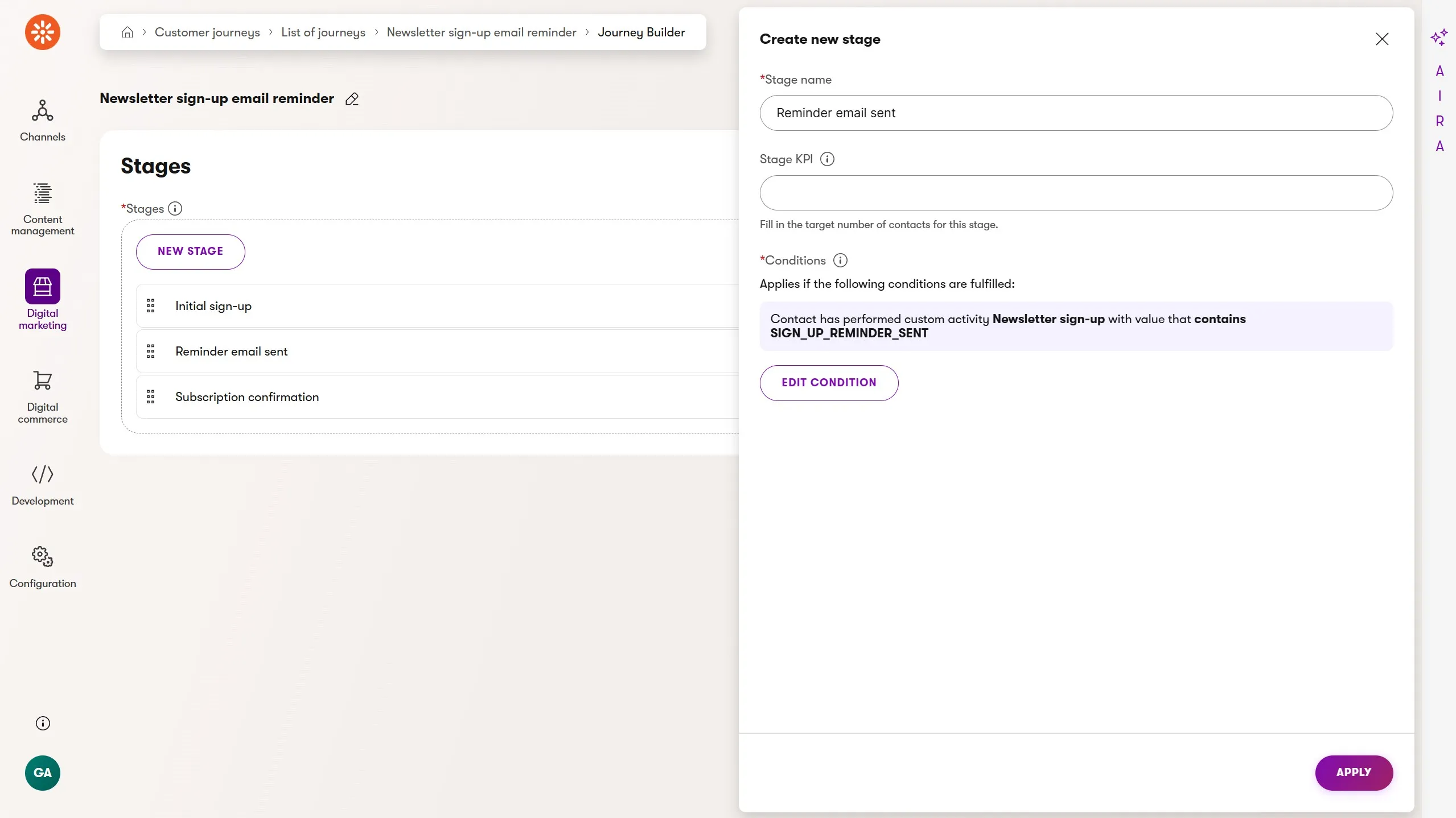 Customer journeys bring measurement, insight, and optimization to the strategy, content, and actions behind your automations. The stages in a customer journey capture key engagement points in a customer’s experience as they move toward a goal you define.