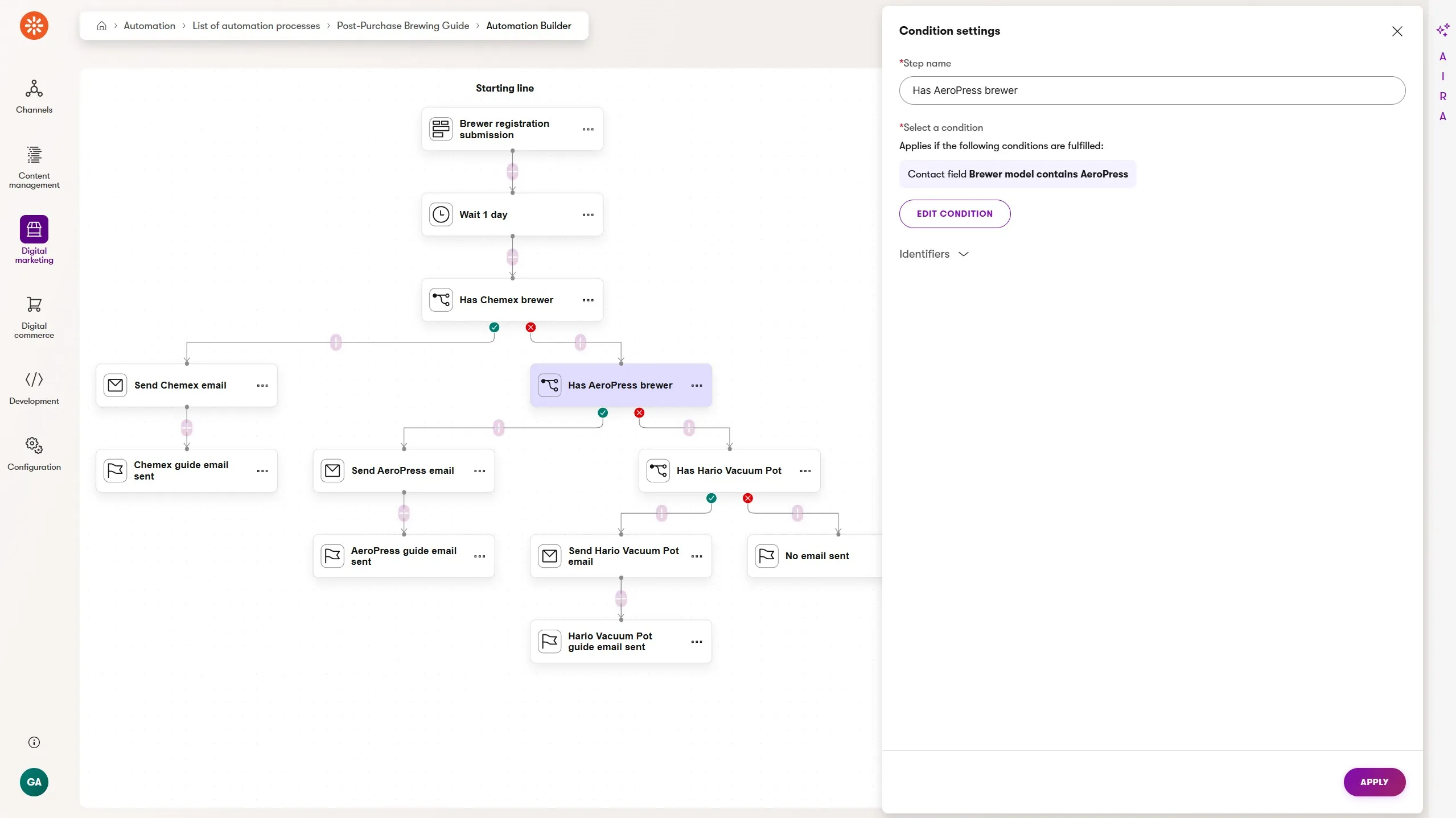- Send email - if yes: a grinder recommendation email, nudging toward a complementary purchase. If no: a softer follow-up Chemex FAQ is sent after 7 days to customers who might be struggling quietly