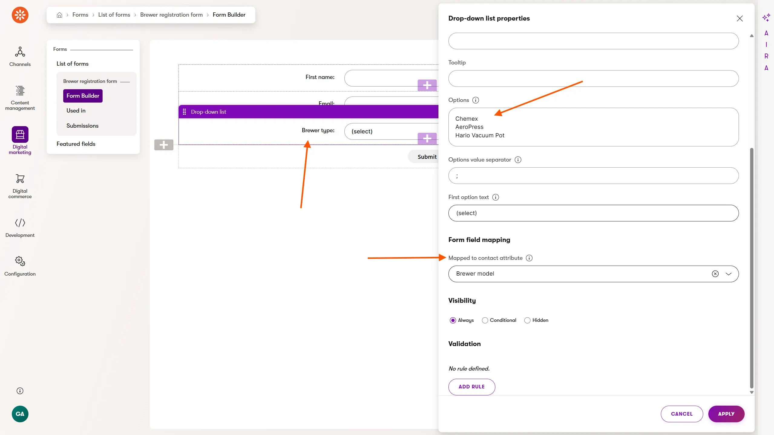 You must map the dropdown field value to the ContactDGBrewerModel contact attribute in the form's field mapping settings. When a customer submits the form, the selected brewer is written directly to the contact record.