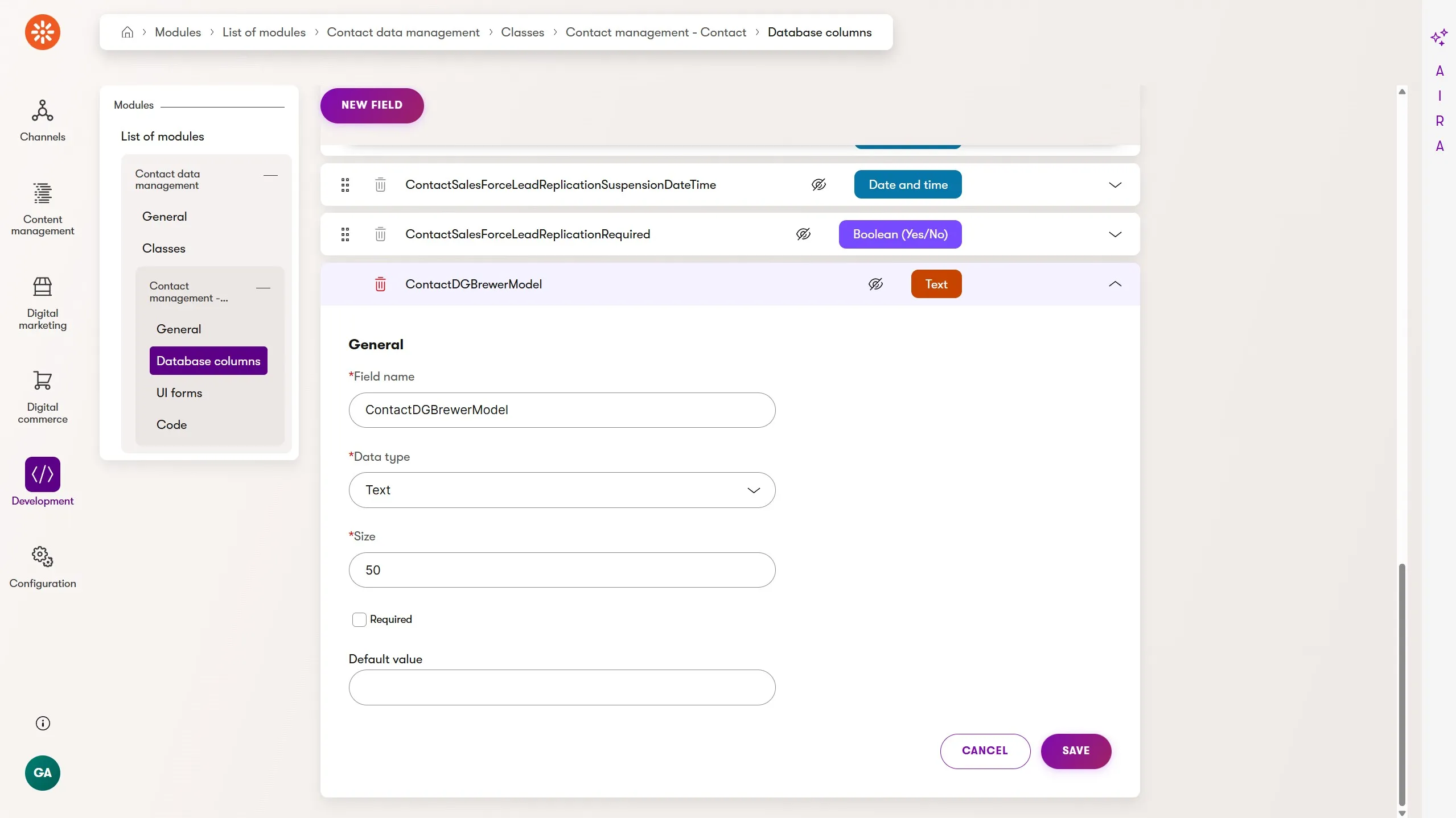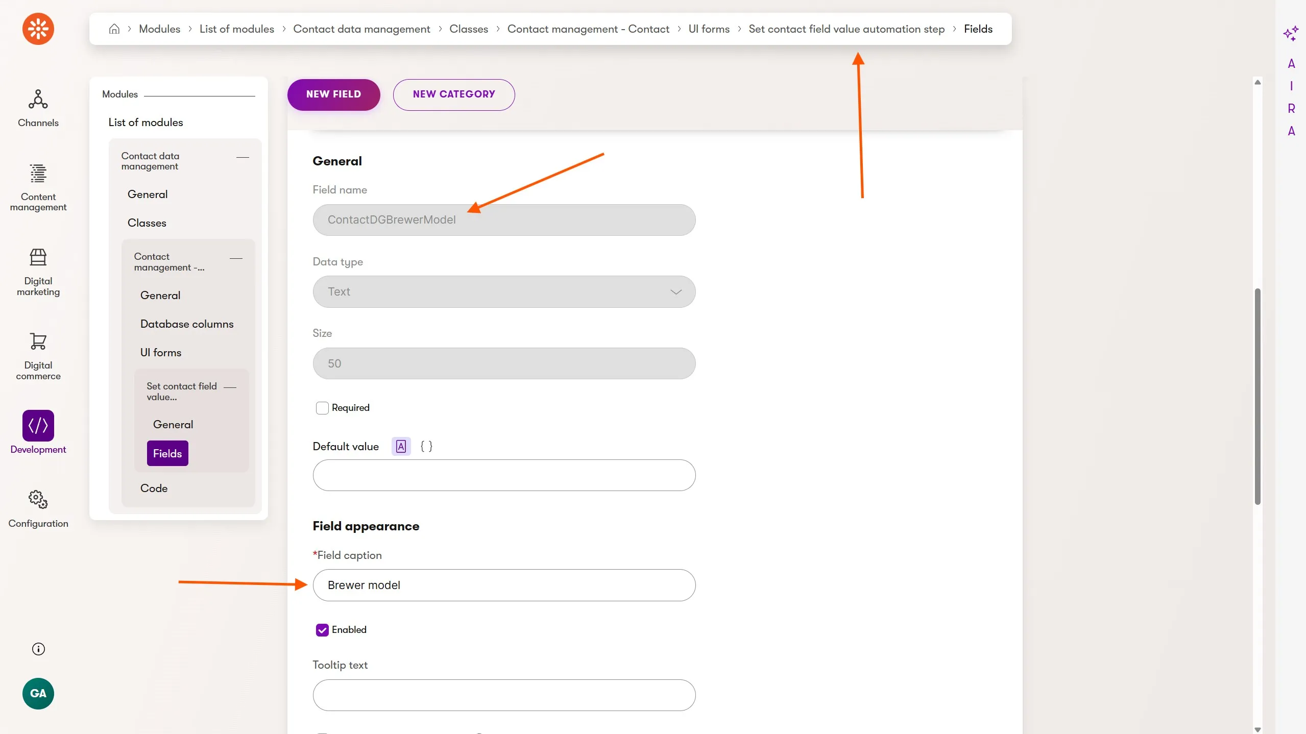 Although the field has been added to the Contact object, it isn't yet visible through Xperience's administration UI. For the ContactDGBrewerModel field to be available in our automation, we also need to add it to the Set contact field value automation step UI form.