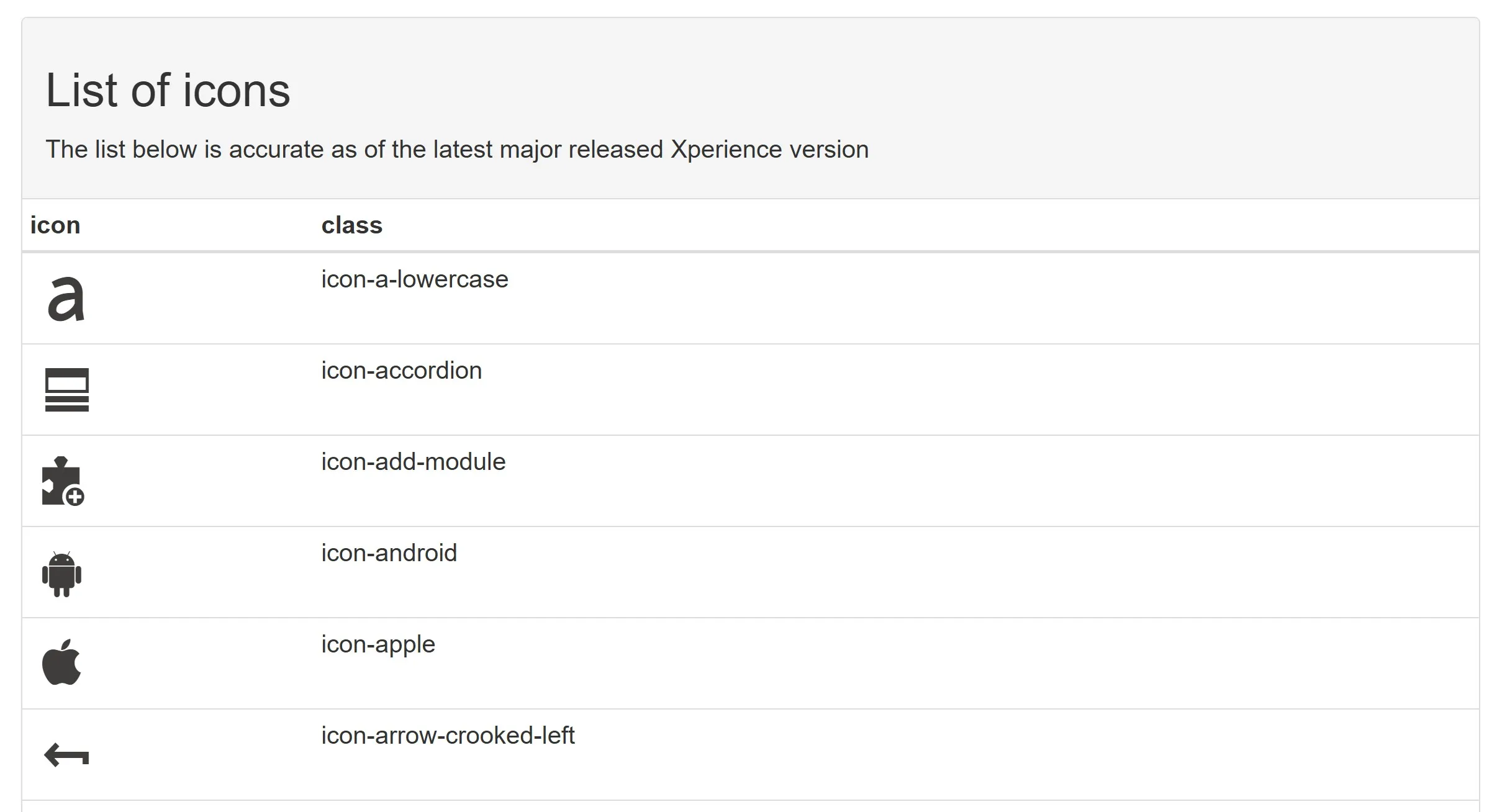 However, that isn’t the only icon set in the Xperience administration UI. An older set - still used for Page Builder, Email Builder widgets, and Form Builder components - is available separately for reference at https://devnet.kentico.com/docs/icon-list/index.html.
