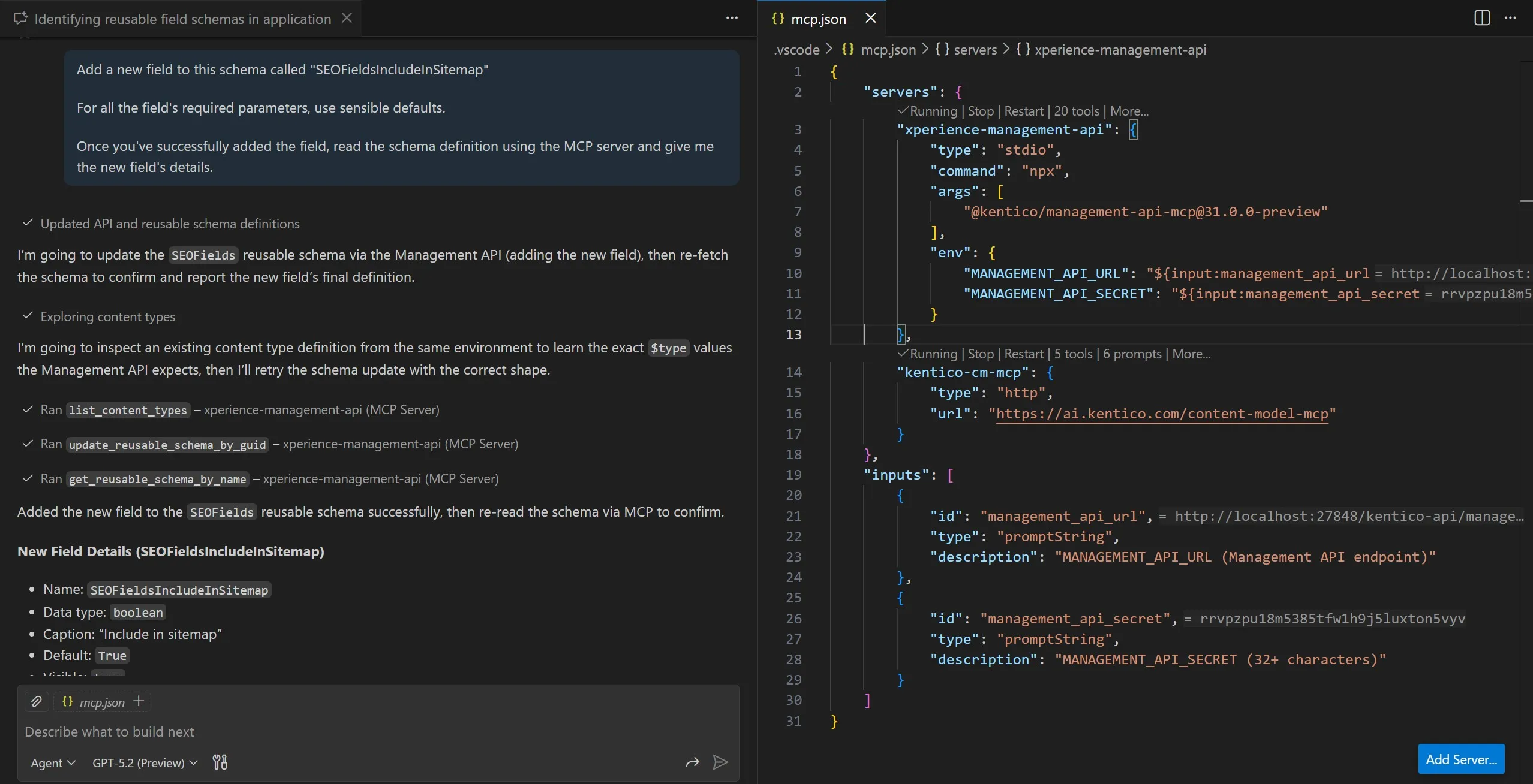 The original content types MCP server was read-only - it didn't support content type creation or updates. To fill in the gaps in a truly agentic AI developer workflow, we need a way to take the output of our content modeling MCP server and automate the creation or update of content types in Xperience.
