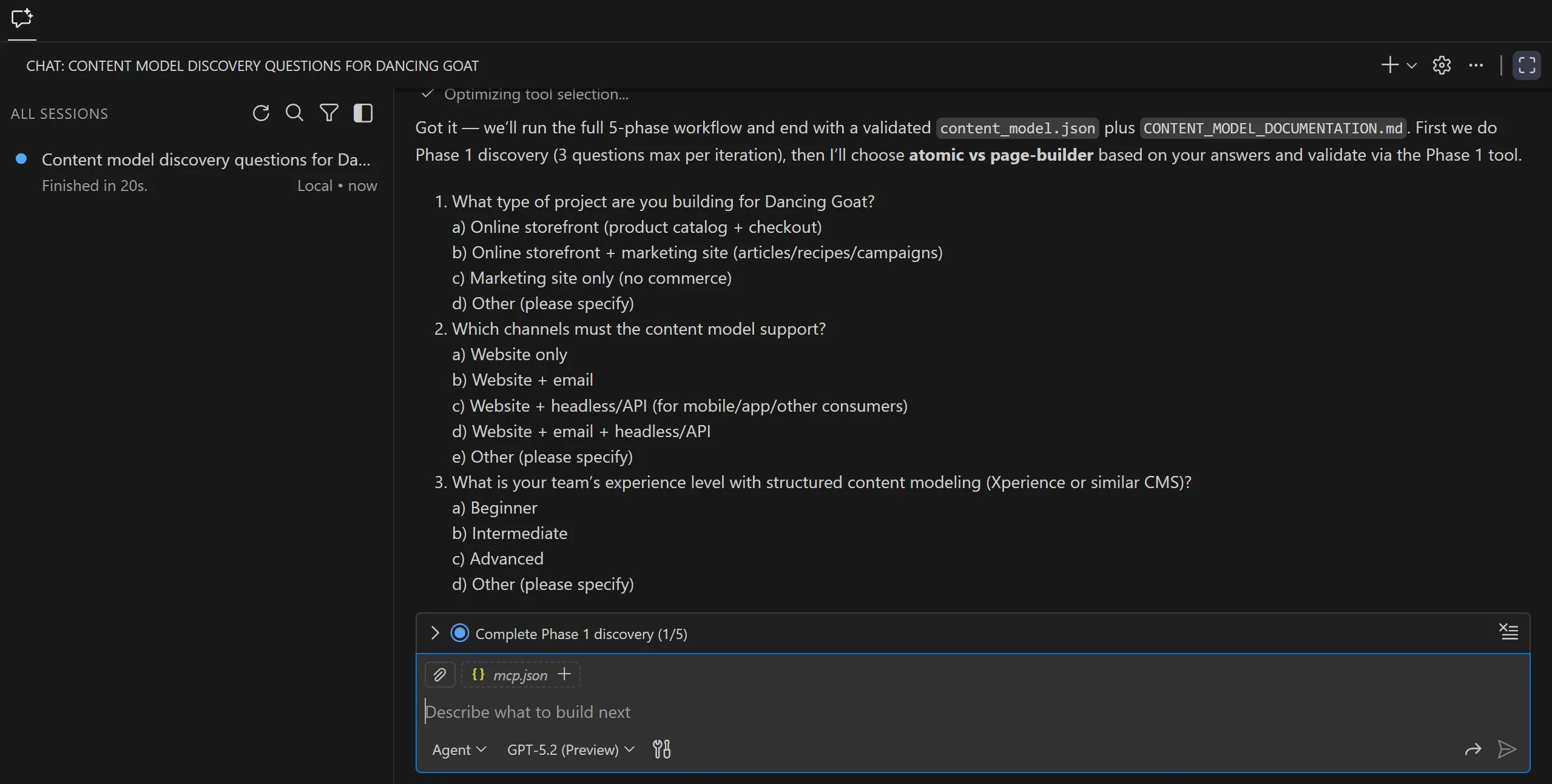 This MCP server is hosted in our own infrastructure and is meticulously designed to incorporate our best knowledge and take you through a multi-step modeling journey. It can design a content model for brand new (greenfield) projects or validate changes to content structures in an existing Xperience by Kentico solution.