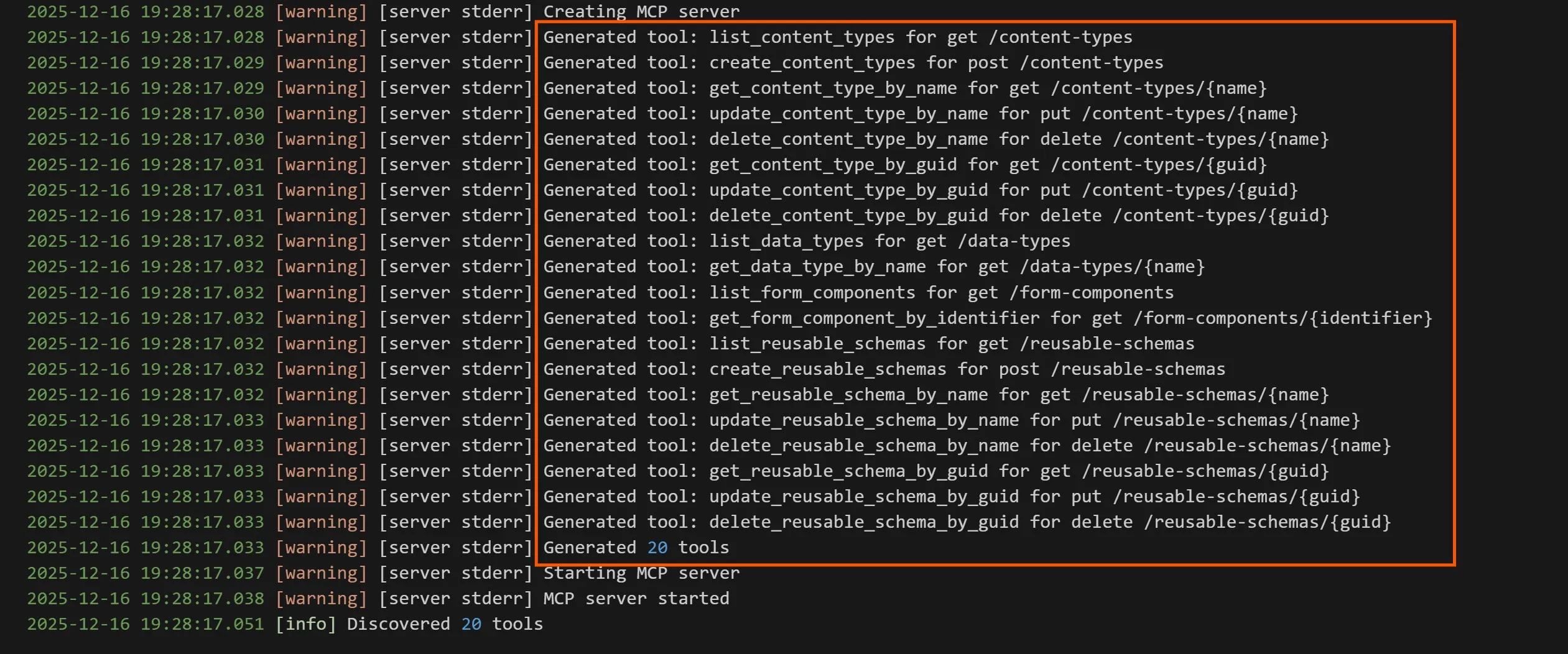 We now include 20 different tools, which include CRUD operations for content types and reusable field schemas.