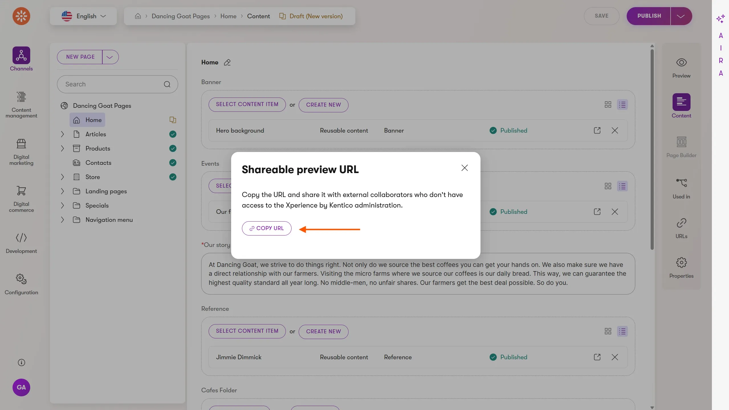 Xperience now comes with shareable previews, enabling content marketers to quickly generate a shareable URL that allows anyone to preview the content of any web page managed in a website channel before it's published.