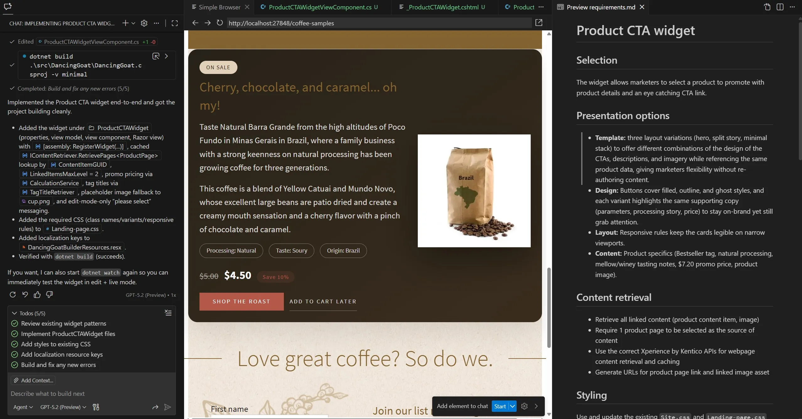 The screenshot above showcases what you can create with this KentiCopilot feature: a Product CTA widget for the Dancing Goat sample application, generated from a 43-line requirements Markdown file and a raw HTML template with some pre-defined CSS rules (also agent-generated 😉).
