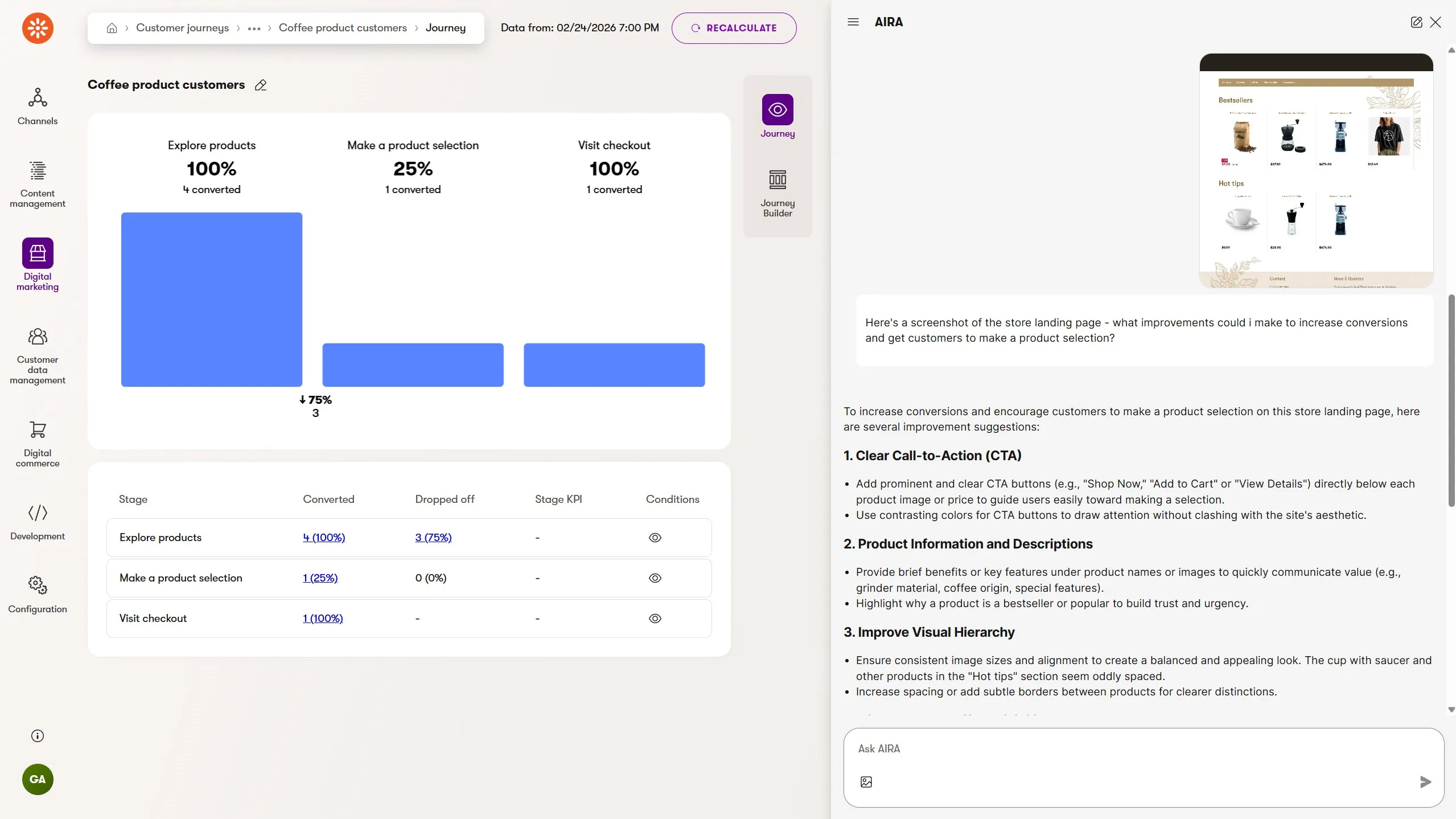 Image support for AIRA chat also improves customer journey insights. Marketers can quickly take a screenshot of a web page modeled in a customer journey and describe to AIRA how it's relevant to the journey's stages and conversion rates. AIRA's feedback will include helpful tips, identifying improvements to the customer experience that could meaningfully impact journey completion.