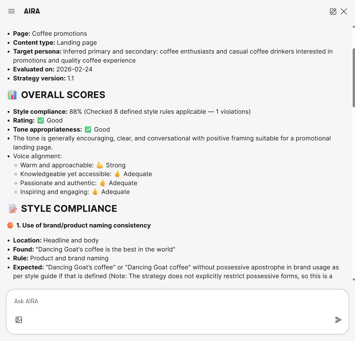 Leveraging the content strategy, the agent will grade your page's messaging in three key areas - voice, tone, and style - and point out common mistakes like misaligned brand language, grammatical anti-patterns, and inconsistent tone.