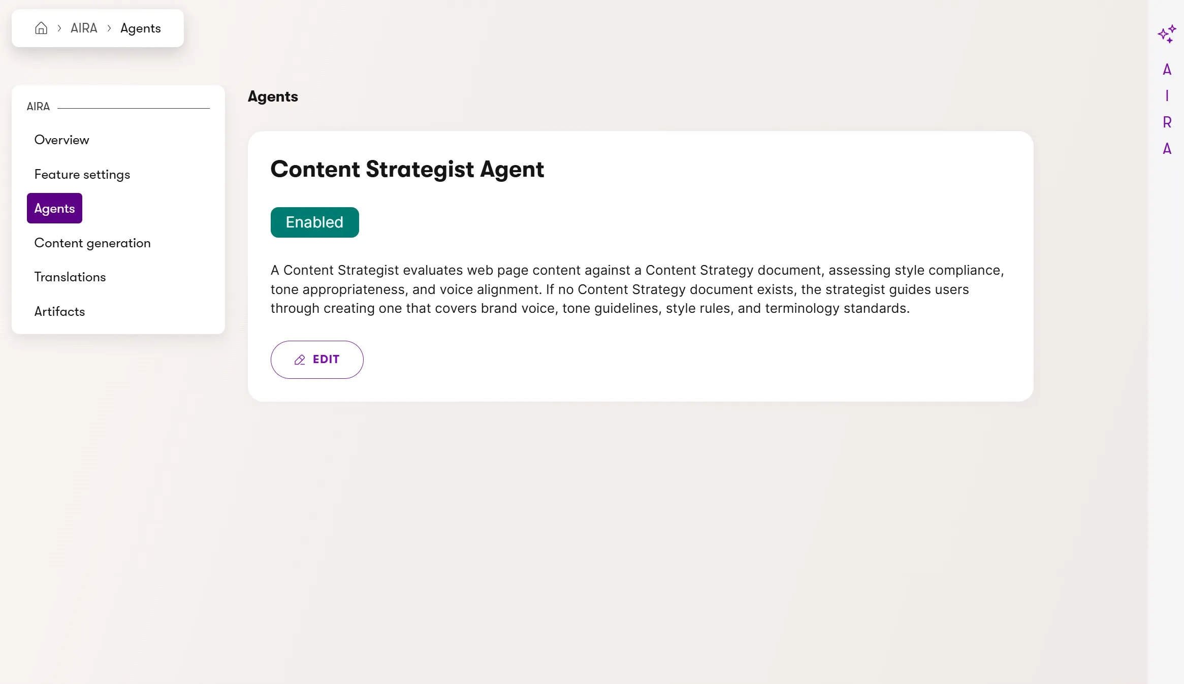 For teams that want full control over their experience with the Content Strategist agent, they can configure it through a custom instructions prompt or disable it globally in the AIRA application.