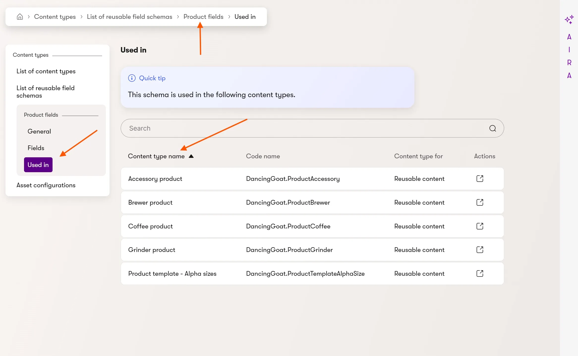 To speed up content model exploration, we enabled a usage tracking view for reusable field schemas.