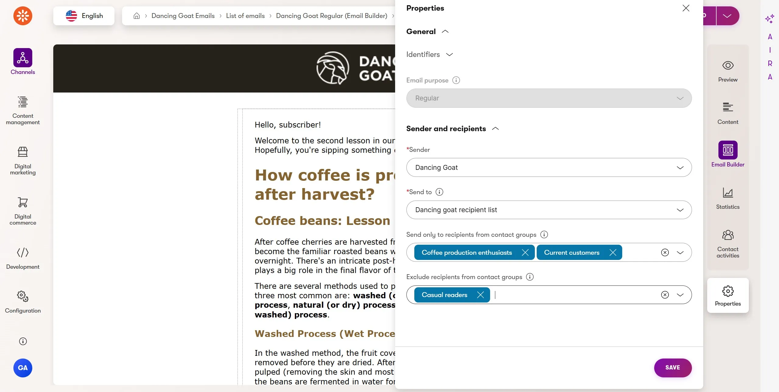 Getting the right email to the right contact is as simple as selecting contact groups from a dropdown list in the email's properties!